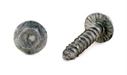 Kraftig træskrue fremstillet i 8.8 stål med sekskantet hoved med integreret skive og riller under hovedet. Ved montering mod metal ”låser” rillerne sig fast, for at hindre at skruen løsner sig.